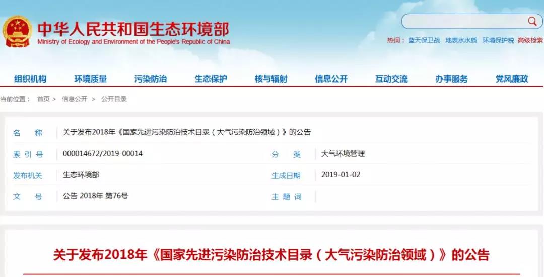 關(guān)于發(fā)布2018年 《國(guó)家先進(jìn)污染防治技術(shù)目錄(大氣污染防治領(lǐng)域)》的公告